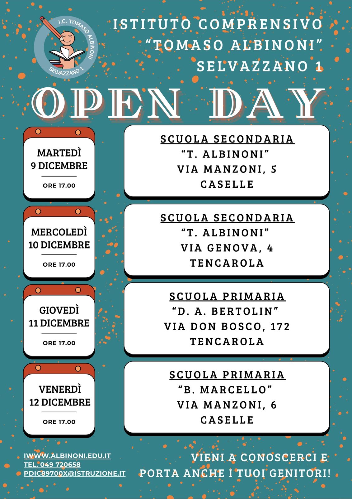 - Scuola Secondaria Tencarola: mercoledì 10 dicembre dalle ore 17.00 alle 19.00;